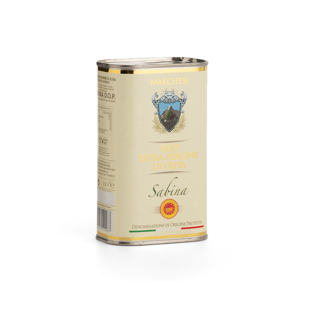 Olio extra vergine di oliva DOP della Sabina in bottiglia in latta. Capacità 500 ml